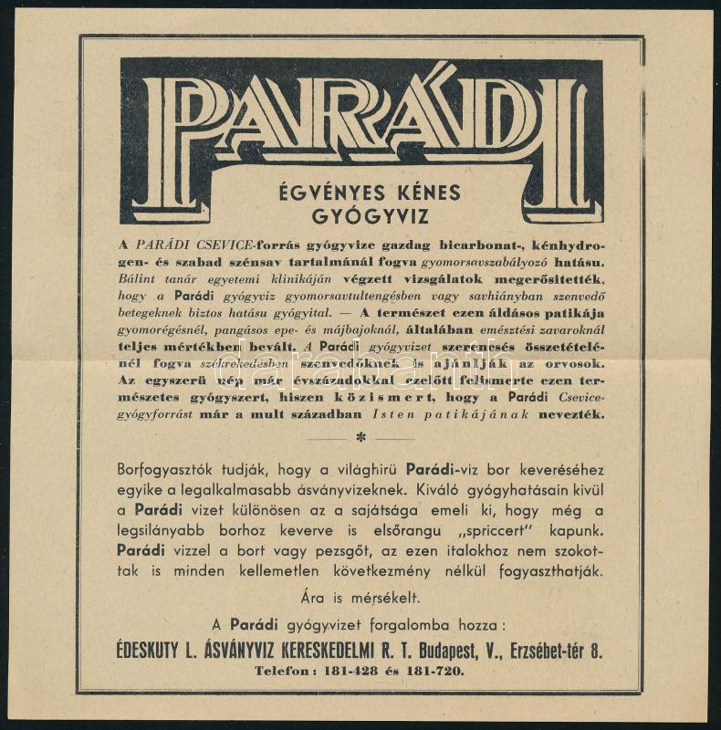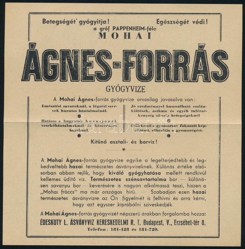 ca 1930 Parádi gyógyvíz / Mohai Ágnes forrás reklám szórólap 16x16 cm