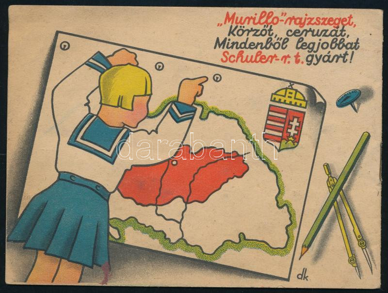 ca 1930 Schuler József rt. 14 lapos rajzos termékbemutató füzete képregényes formában, benne irredenta motívumokkal. 16x12 cm