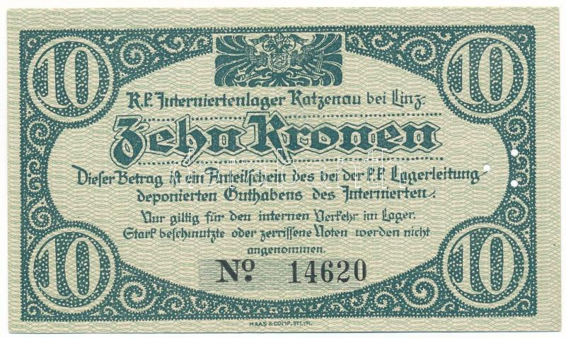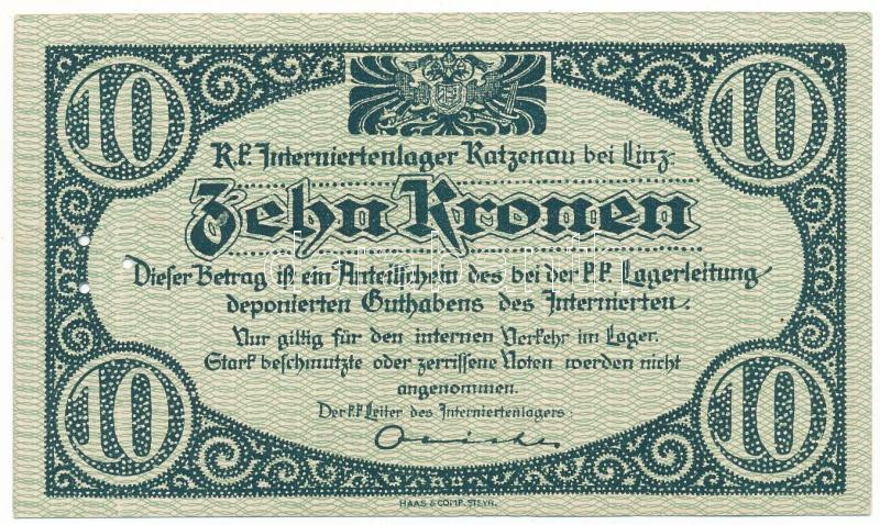 Ausztria / Katzenau Hadifogolytábor Linz közelében 1914-1918 k. 10K három lyukkal perforálva T:UNC,AU