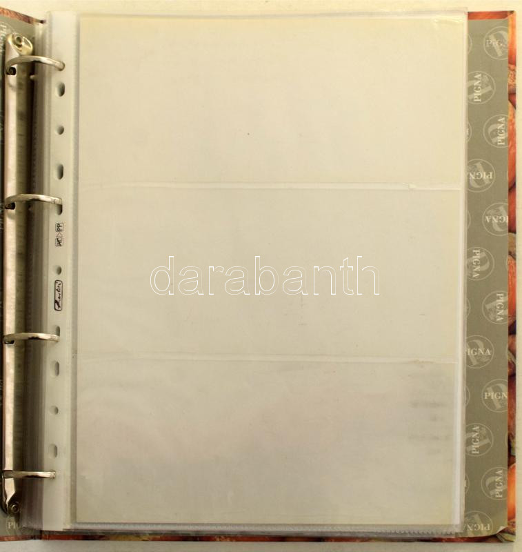 Használt, de jó állapotú négygyűrűs bankjegyberakó album, összesen 36db berakólappal (22db hármas elosztású, 14db kettes elosztású)