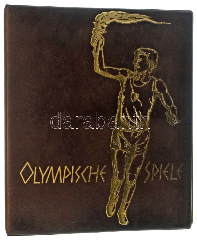 "Olympische Spiele" barna, plüssborítású, négygyűrűs album, 30db osztás nélküli berakólappal, védőtokban. Használt, jó állapotban