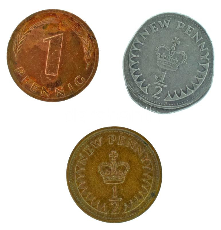Nagy-Britannia 1971-1984. 1/2p + Német Szövetségi Köztársaság 1971F-1984F 1pf érme "fúziója", nem mágneses fém lapkán (1,95g). A félpennys érme elÅ‘lapja teljes egészében, mÃg a túloldalon az egypfenniges érme elÅ‘lapjának egy kis része látszik csak, erÅ‘sen elcsúszva. Eredete, rendeltetése kérdéses. Mindkét érmébÅ‘l támpéldánnyal. T:XF