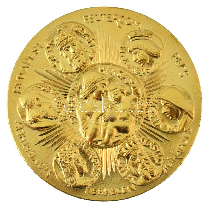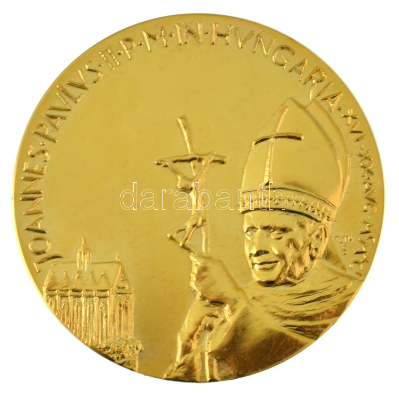 Tóth Sándor (1933-2019) 1991. "JOANNES PAVLVS II P M IN HVNGARIA XVI XX AVG MCMXCI / BUDAPEST ESZTERGOM PÉCS MÁRIAPÓCS DEBRECEN SZOMBATHELY" aranyozott bronz emlékérem műanyag tokban II. János Pál pápa magyarországi látogatása alkalmából (65mm) T:AU