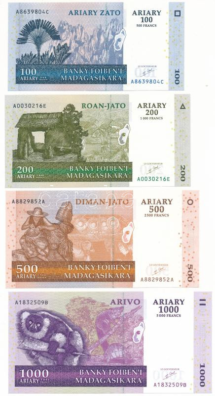 Madagaszkár 2004. 100A / 500Fr + 200A / 1000Fr + 500A / 2500Fr + 1000A / 5000Fr T:I Madagascar 2004. 100 Ariary / 500 Francs + 200 Ariary / 1000 Francs + 500 Ariary / 2500 Francs + 1000 Ariary / 5000 Francs C:UNC