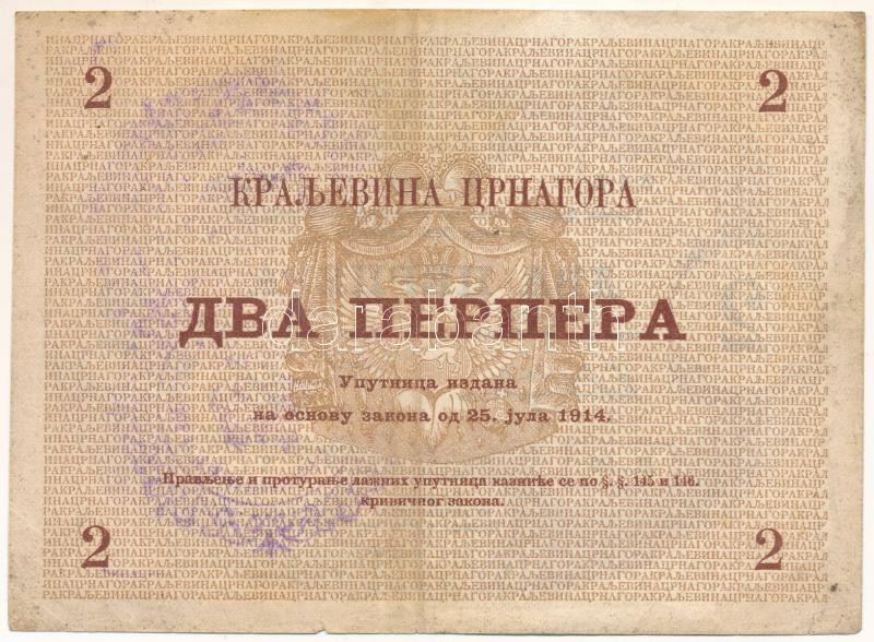 Montenegro / Austro-Hungarian occupation 1914. 2 Perpera overprinted C:F,VG