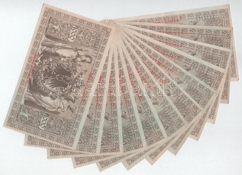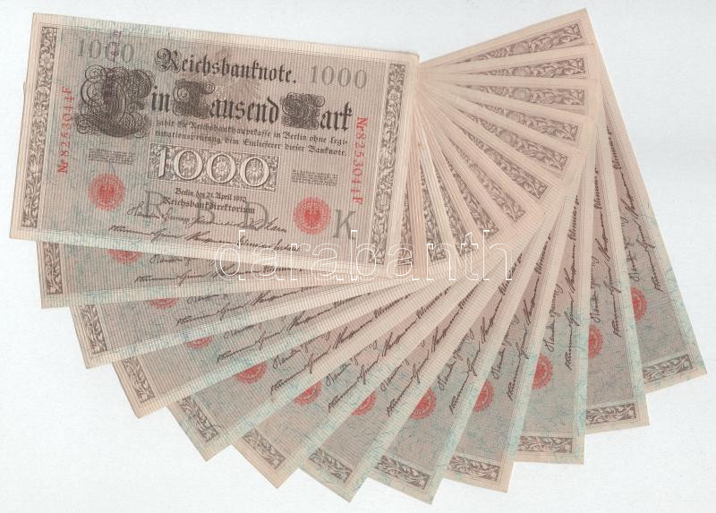 Német Birodalom 1910. 1000M (12x) nagyrészt sorszámkövetők + 1922. kézzel írott pénzváltói dokumentáció a Tokajhegyaljai Takarékpénztárból T:AU