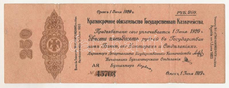 Orosz Polgárháború / Szibéria és Urál / Ideiglenes Szibériai Igazgatás 1919. 250R "45703" T:VG ragasztott