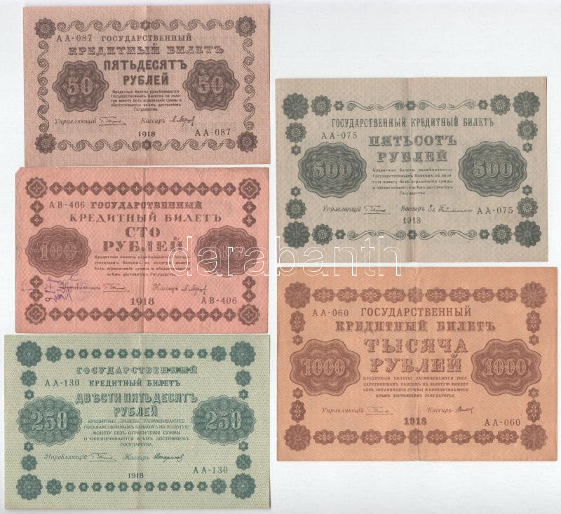 Soviet Union / Russian Socialist Federated Soviet Republic 1918. 50 Roubles + 100 Roubles + 250 Roubles + 500 Roubles + 1000 Roubles C:F,VG