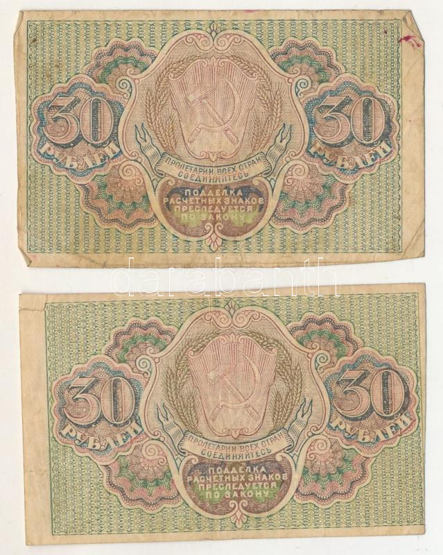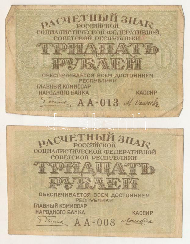 Soviet Union / Russian Socialist Federated Soviet Republic 1919. 30 Rubles (2xdiff signatures) C:F-VG