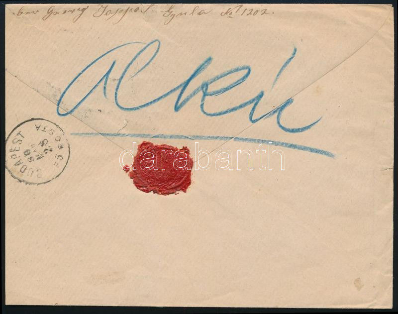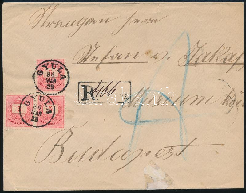 1886 Ajánlott levél kézzel írt ragjeggyel, 3 x 5kr bérmentesítéssel (az egyik pár), "GYULA" - "BUDAPEST / FŐPOSTA"