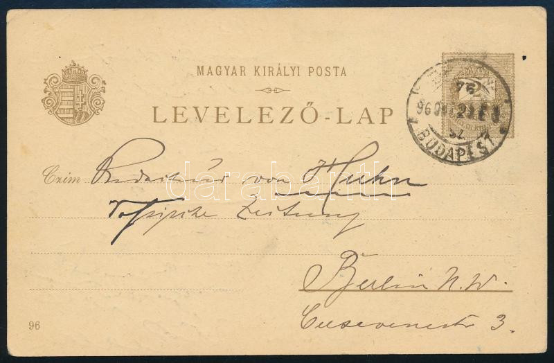 1896 Milleniumi 2kr díjjegyes képeslap vasúti bélyegzéssel Berlinbe