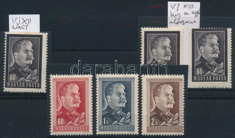 1950-1953 Sztálin sor + Sztálin-gyász 3 db bélyeg XII. vagy XIII. vízjellel, az egyik elfogazva (1 bélyegen halvány rozsda / light stain)