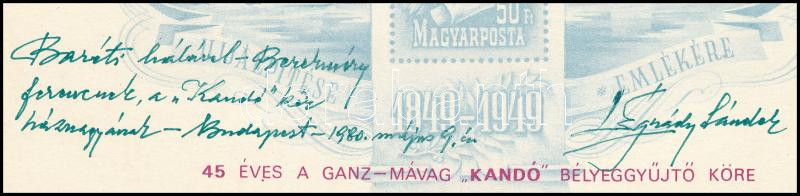 1980 Légrády Sándor grafikusművész pályafutásának 50 éves évfordulójára kiadott, a Lánchíd III. blokkot ábrázoló emléklap, bélyegkiállítási alkalmi bélyegzéssel, Légrády üdvözlő szöveggel és aláírással / Stamp exposition souvenir card with design of the Chain bridge block, with handwriting and signature of stamp designer Légrády