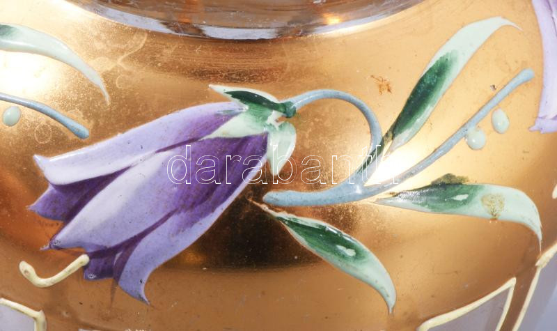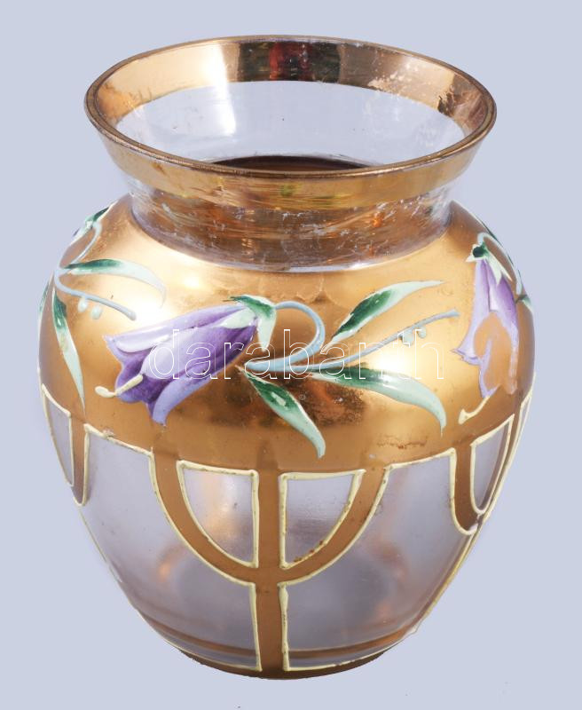 Szecessziós zománcfestett kisváza, kis kopással, m: 8 cm