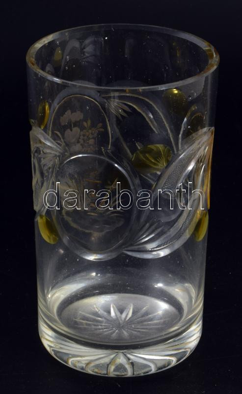 cca 1880 Emlékpohár ezüstpácolt díszítéssel, körben a Hit, remény, szeretet csiszolt szimbólumaival, kis pattogzással, m: 14,5 cm