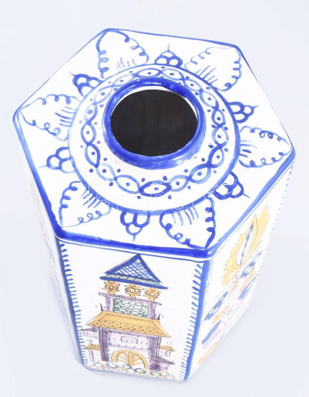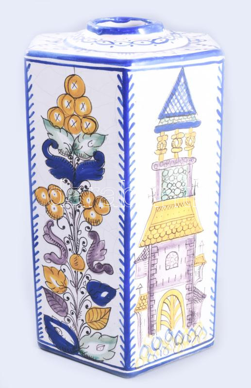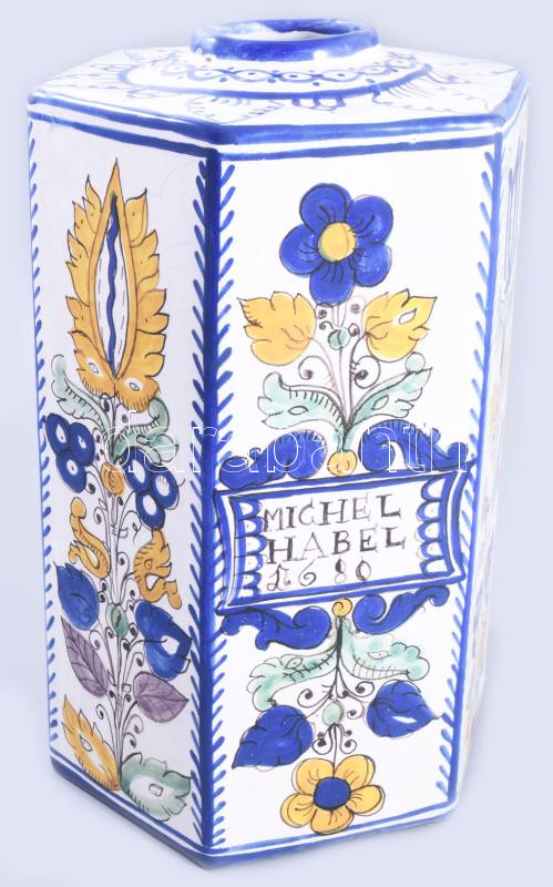 Habán múzeumi másolat olaj tartó. Mázas kerámia, kézzel festett, jelzett, mázrepedéssel 27 cm