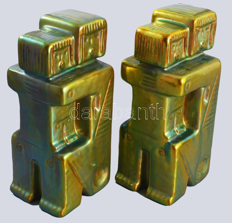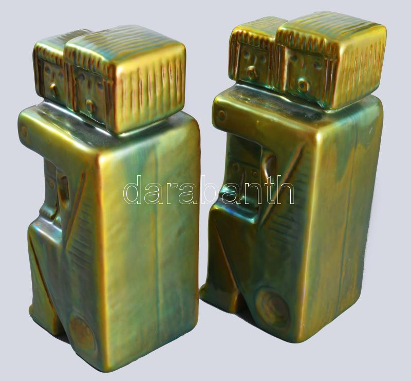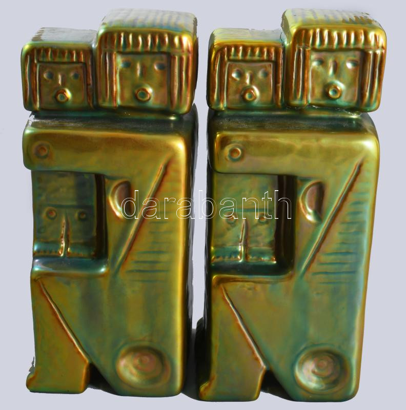 Zsolnay kisplasztika - Anya gyermekével könyvtámasz pár. Terv.: Nádor Judit (1934-2018). Selyemfényű eozinmázakkal fedett öntött finomfajansz. Egyik darab hibátlan, a másik ragasztott, m: 21 cm