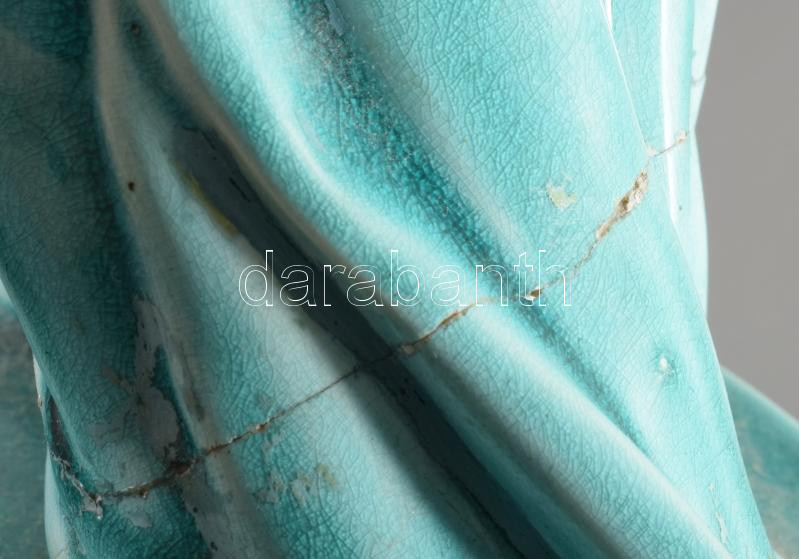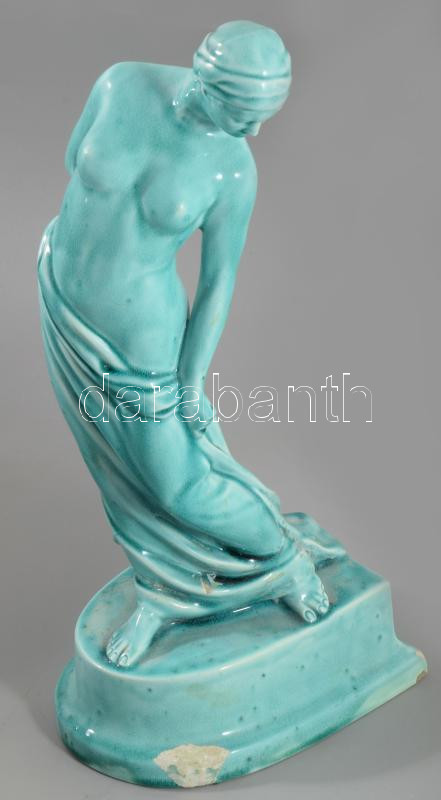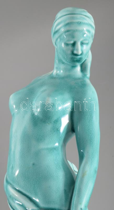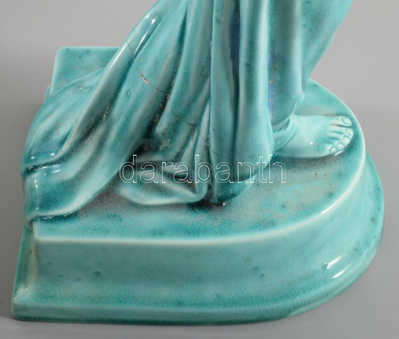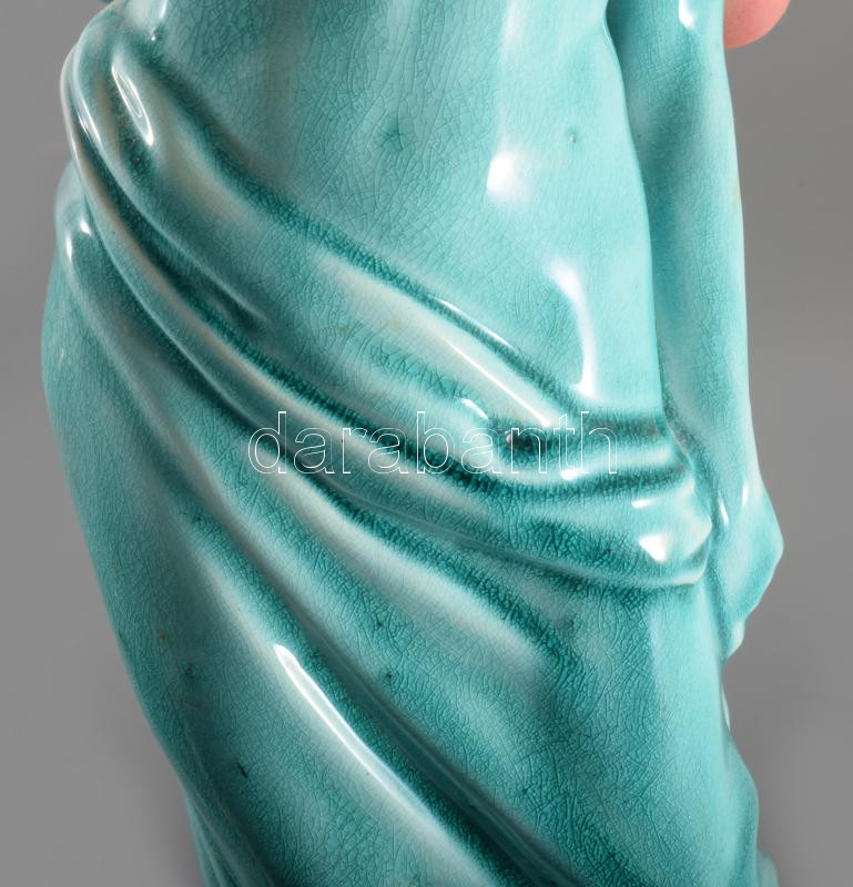 Zsolnay kisplasztika - akt lepellel. Formába öntött, alapmázzal borított fehércserép. Jehring Aranka modellje, 1916. Alján jelzett: masszába nyomott 8866 formaszám és pecsét. Ragasztott, alsó részén lepattanásokkal, felületi sérülésekkel, m: 35 cm
