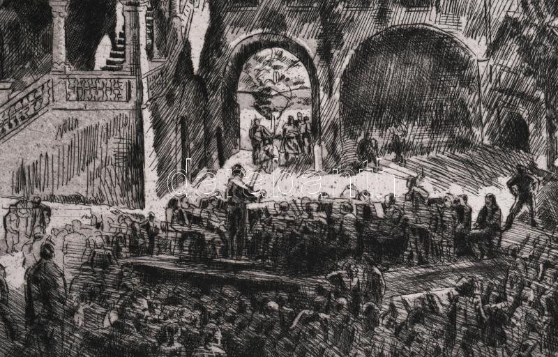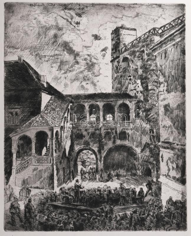 Beschreibung: Aszódi Weil Erzsébet (1901-1976): Hangverseny a Rákóczi várban (Sárospatak). Rézkarc, papír, jelzett a karcon, 37×29,5 cm