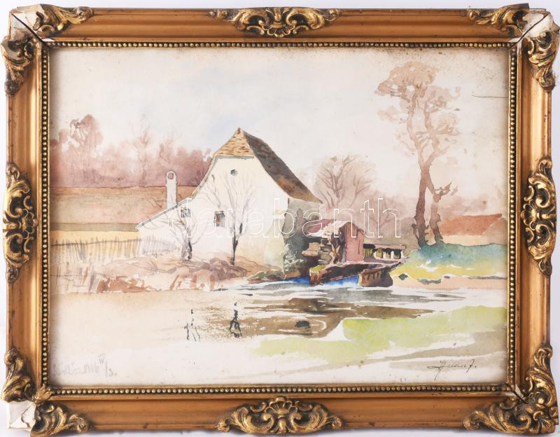 Beschreibung: Halász József (1874-1935): Vízimalom, Szöllős (Sopron környéke), 1916. Akvarell, papír, jelzett. Kissé foltos. Dekoratív, üvegezett, sérült fakeretben, 23×30 cm