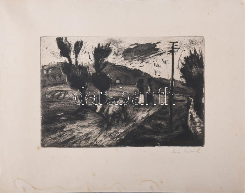 Beschreibung: Iván Szilárd (1912-1988): Úton (cím nélkül). Rézkarc, aquatinta, papír, jelzett, kartonra kasírozva. Lapszéli ázásnyommal. 19,5x29 cm
