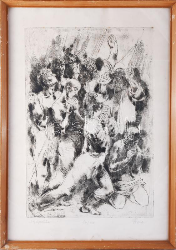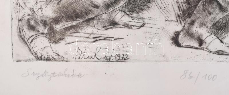 Beschreibung: Pituk József Viktórián (1906-1991): Segélythívók, 1972. Rézkarc, papír, jelzett, számozott (86/100), apró foltokkal, üvegezett fakeretben, 49,5×33 cm