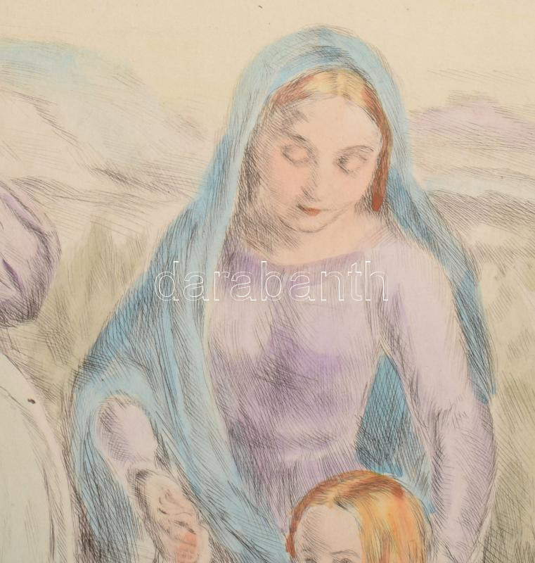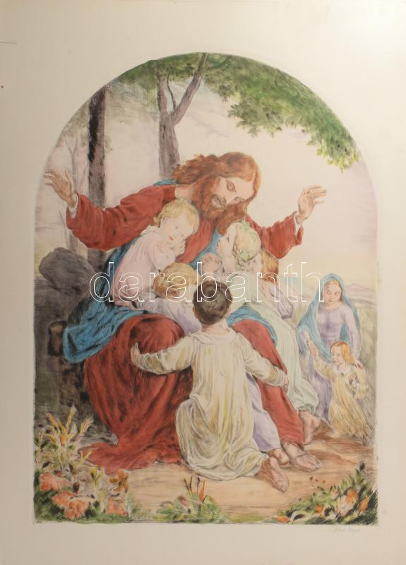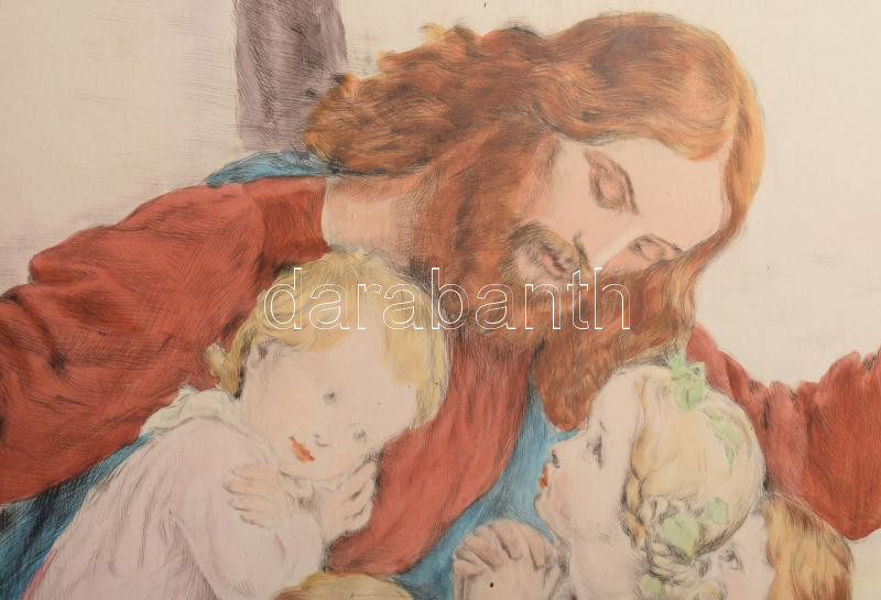 Beschreibung: Prihoda István (1891-1956), C. Vogel pinx: Engedjétek hozzám... (Jézus gyerekekkel). Színezett rézkarc, papír, jelzett (Vogel pinx). Lapszéli elszíneződésekkel. 63×48 cm.