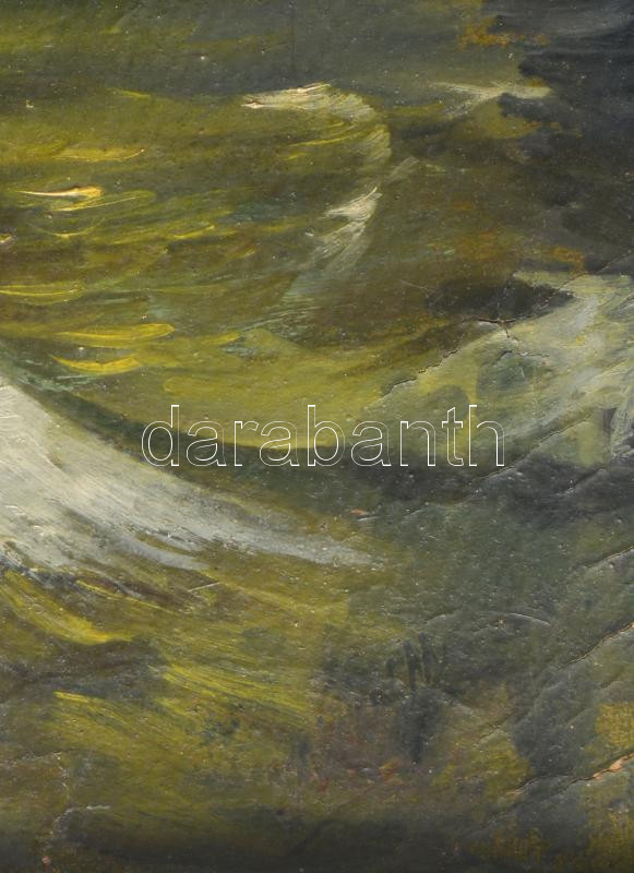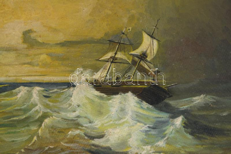 Jelzés nélkül: Hajó a tengeren. Olaj, karton. Kissé sérült. 47,5x63 cm. Dekoratív, sérült fakeretben