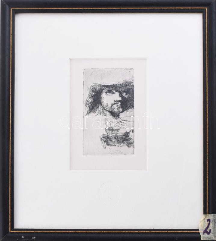 Jelzés nélkül, Rembrandt után: Arckép. Rézkarc, papír. Üvegezett fakeretben. 10x5,5 cm.