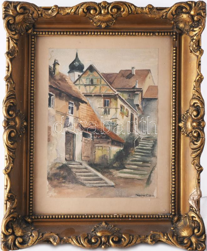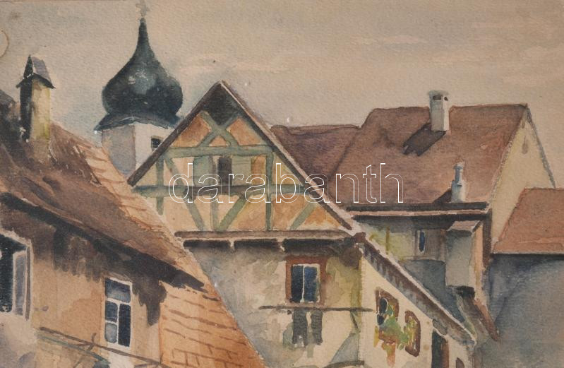 Mészáros E jelzéssel: Kisváros. Akvarell, papír, jelzett, elszíneződés...