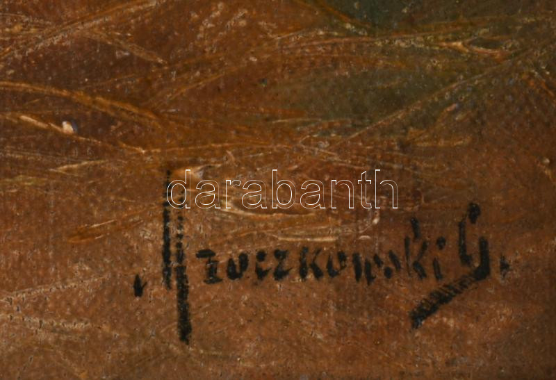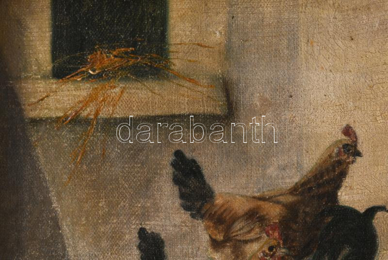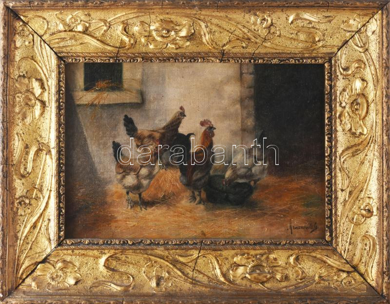 Olvashatatlan (Mroczkowsky?) jelzéssel: Baromfiudvar. Olaj, vászon, javított, kissé sérült. Dekoratív, szecessziós, kissé sérült fakeretben, 22x33 cm
