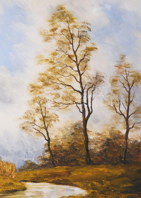 Olvashatatlan jelzéssel, XX. sz. második fele: Vízparti táj. Olaj, farost. Fakeretben. Hátoldalán müncheni képkeretező raglapjával. 45x57 cm.