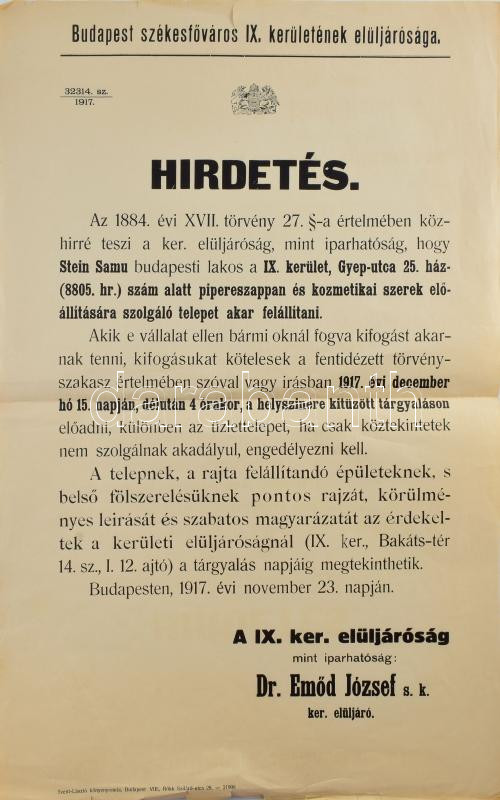 Beschreibung: 1917 IX. Gyep utcai (Thaly Kálmán u.) kozmetikai gyár létesítését bejelentő plakát 30x48 cm