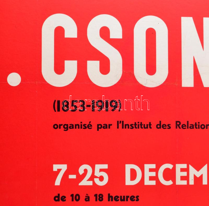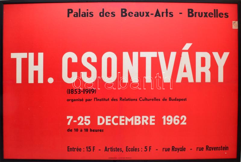 1962 [Csontváry Kosztka Tivadar] Th[éodore] Csontváry (1853-1919), Palais des Beaux-Arts - Bruxelles, 7-25 decembre 1962, francia nyelvű belga kiállítási plakát, Bruxelles, Imp. Marci, a szélén bélyeggel, hajtásnyomokkal, javított, 80x120 cm. Kiállítva: Home Galéria, Bp., 2003. Fakeretben. Ritka! KIZÁRÓLAG SZEMÉLYES ÁTVÉTEL, NEM POSTÁZZUK! / ONLY PERSONAL COLLECTION AT OUR OFFICE!