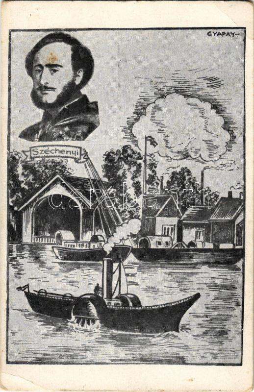 Budapest X. Dunai hajózás, óbudai hajógyár, gőzhajó. "Egy magyar még semmi, száz magyar még semmi, millió magyar ha találkozik egyszer, megmozdul a vén föld és új pályán kezd futni". Széchenyi emlék-levelezőlap a Széchenyi Munkaközösség kiadása s: Gyapay (EK)