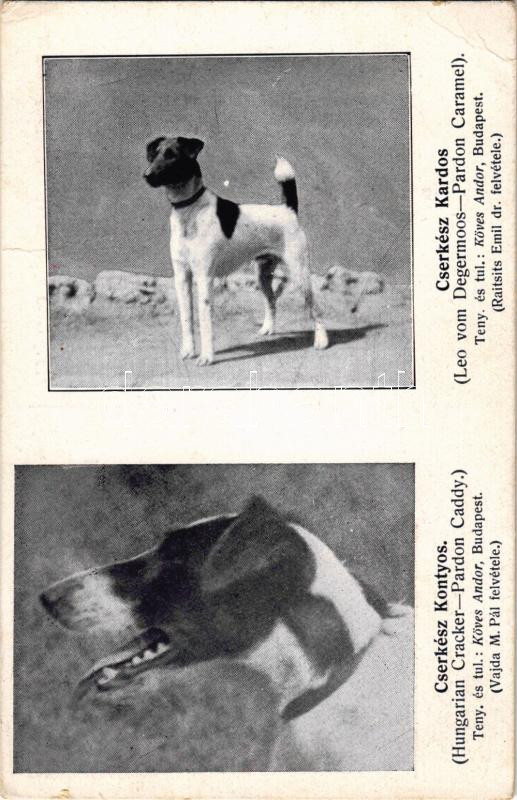 Cserkész Kontyos (Hungarian Cracker - Pardon Caddy.). Cserkész kardos (Leo vom Degermoos - Pardon Caramel). Tenyésztő és tulajdonos Köves Andor. Magyar Foxterrier Tenyésztők Egyesülete. Vajda M. Pál és Raitsits Emil dr. felvételei. Kiadja ifj. Kellner Ernő / Hungarian Fox Terriers (Rb)