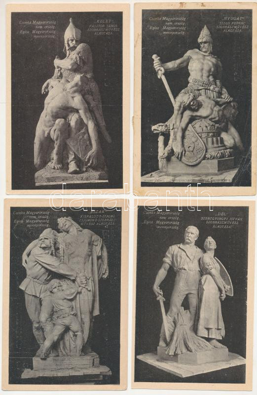 Budapest V. Szabadság tér - 4 db RÉGI irredenta szobor képeslap egy sorozatból: Észak, Dél, Kelet, Nyugat / 4 pre-1945 Hungarian irredenta postcards, series s: Kisfaludy-Strobl Zsigmond