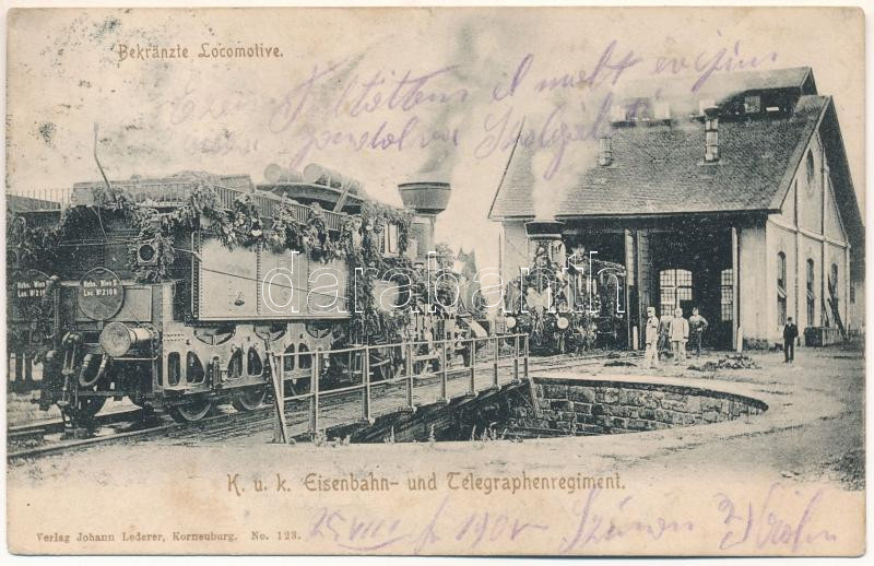 1905 Korneuburg, K.u.K. Eisenbahn- und Telegrafenregiment, Bekränzte Lokomotiven. Johann Lederer / railway statiton, garlanded locomotive, K.u.K. Railway and Telegraph Regiment (Rb)