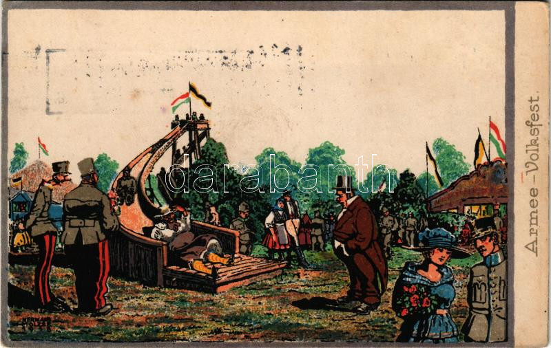 1918 Armee-Volksfest. Kriegsfürsorge der k.u.k. 1. Armee / WWI Austro-Hungarian K.u.K. military art postcard, army festival. Druck u. Verlag Lehmann (Kronstadt-Brassó) litho s: Hermann Molzer + "Art. Ersatz-Gruppe der 1. Armee" (EK)