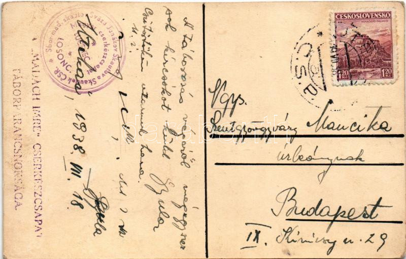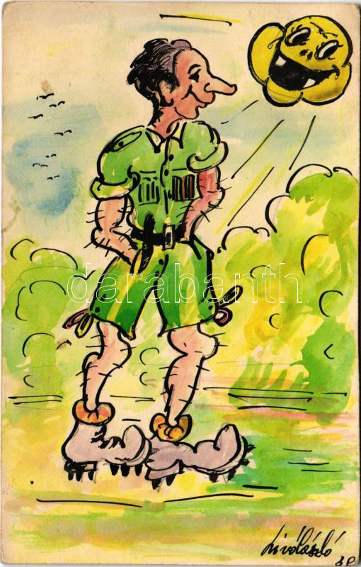 1938 Losonc, Lucenec; Kézzel rajzolt egyedi magyar cserkész művészlap / Hungarian boy scout art postcard, hand-drawn s: Livó László + "A Madách Imre cserkészcsapat táborparancsnoksága" (vágott / cut)