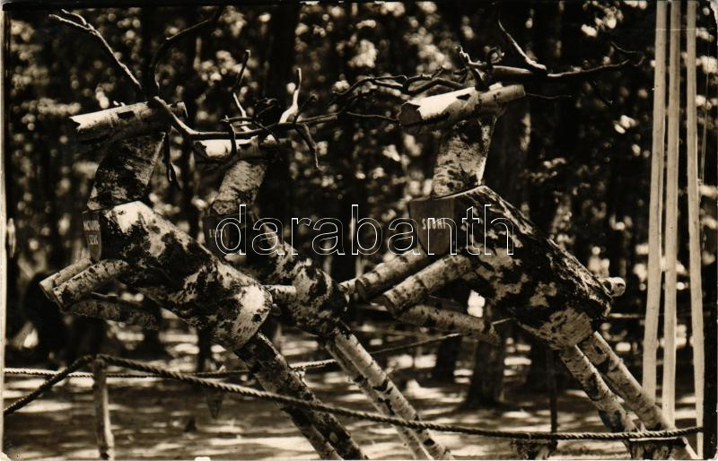Gödöllő, Cserkész Jamboree, Suomi, Eesti, szarvasok fából faragva / Hungarian boy scout camp, Finnish wooden deer statue. photo (Rb)