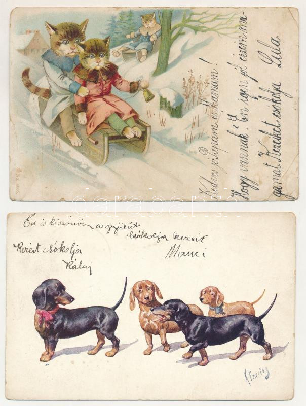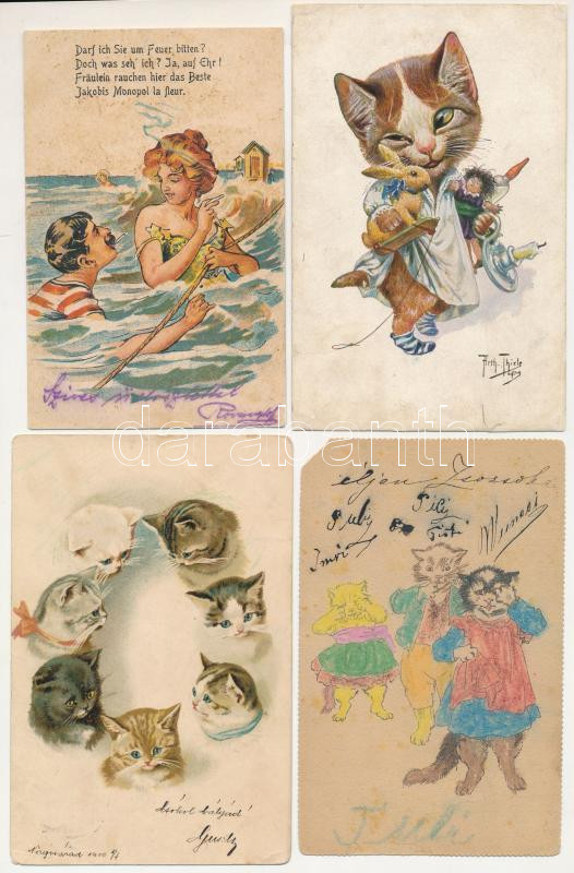 9 db RÉGI motívum képeslap: macskák és kutyák + 1 humoros cigarettázós; vegyes minőség / 9 pre-1945 motive postcards: cats and dogs + 1 humorous cigarette smoking; mixed quality
