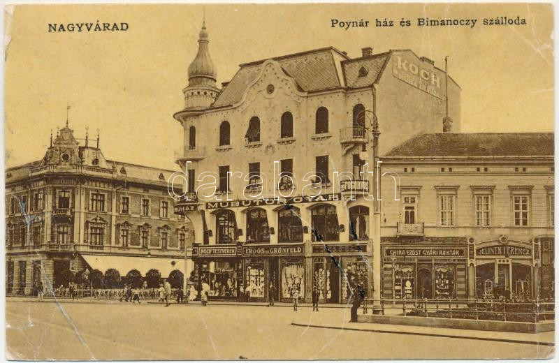 1909 Nagyvárad, Oradea; Poynár ház és Rimanóczy szálloda, Koch Testvérek, Erdős és Grünfeld, Jelinek Ferenc üzlete, Műbútorgyár, fogorvosi rendelő, China ezüst gyári raktár. Klein Sándor és Vilmos kiadása / palace, hotel, shops, furniture factory, dentist's office, silverware warehouse (EB)