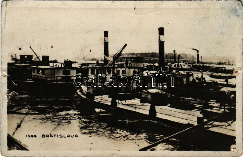 1933 Pozsony, Pressburg, Bratislava; gőzhajók, kikötő / steamships, port. photo (lyukak / pinholes)