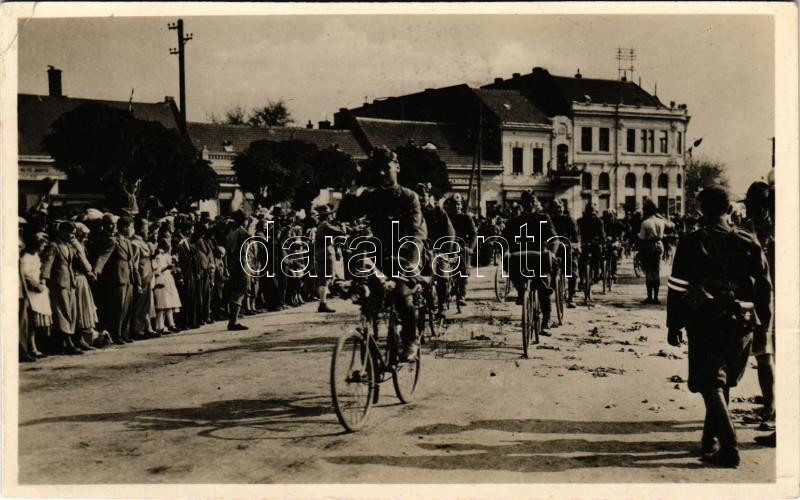 1938 Ipolyság, Sahy; bevonulás. A Felvidék felszabadulásának első örömünnepe 1938. október 11. Kerékpáros katonák / entry of the Hungarian troops, soldiers on bicycles (EK)