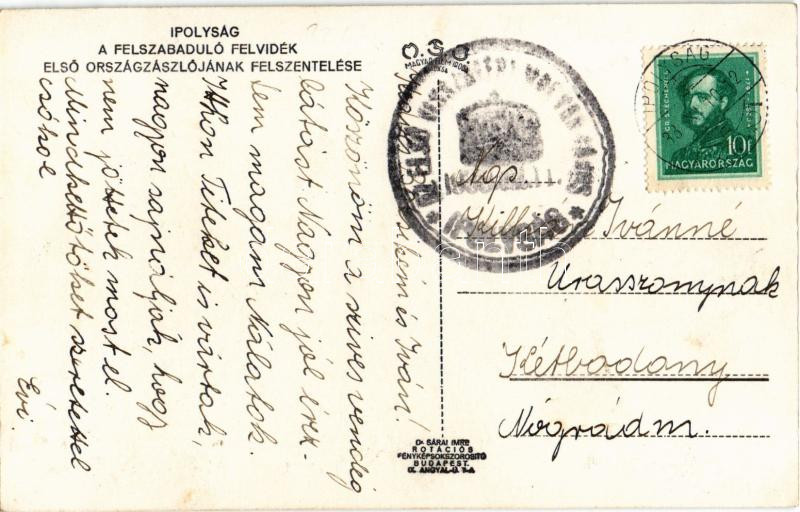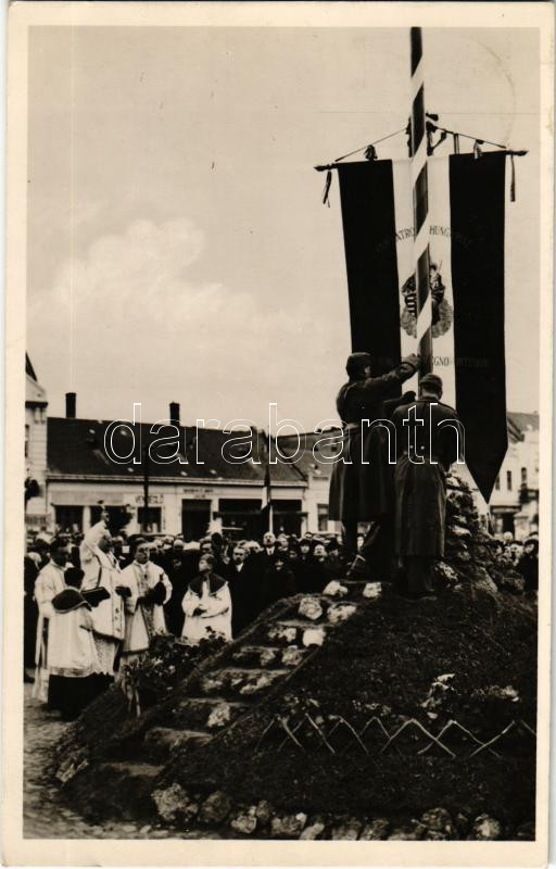 1938 Ipolyság, Sahy; bevonulás. A felszabaduló Felvidék első Országzászlójának felszentelése / entry of the Hungarian troops, consecration of the Hungarian flag + "1938 Az Első Visszatért Magyar Város Ipolyság" So. Stpl.