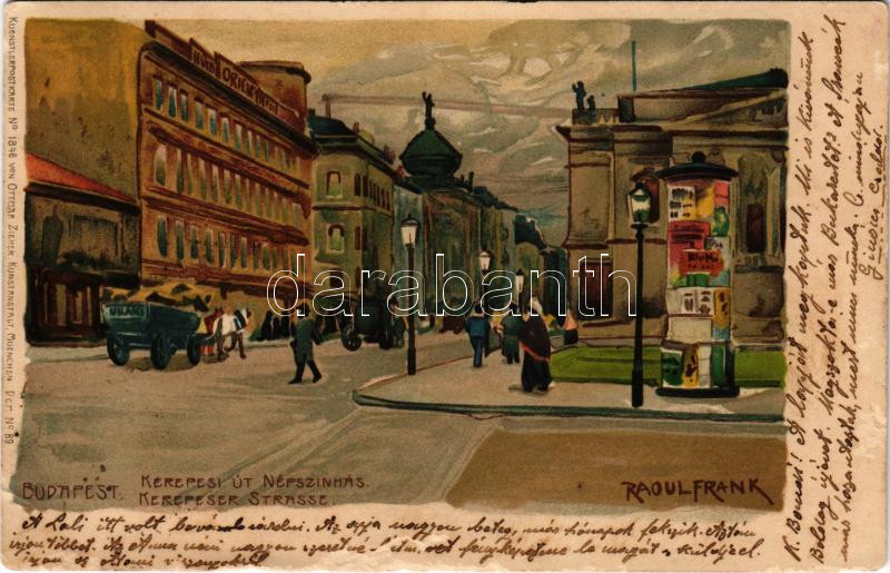 1925 Budapest VIII. Kerepesi út és Népszínház, hirdetőoszlop. Kuenstlerpostkarte No. 1846. von Ottmar Zieher No. 89. litho s: Raoul Frank (b)
