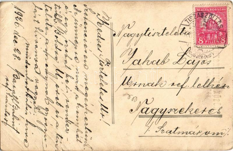 1926 Tiszaszőlős, Tiszaszöllös; Hősök emlék szobor megkoszorúzva. photo (gyűrődések / creases)