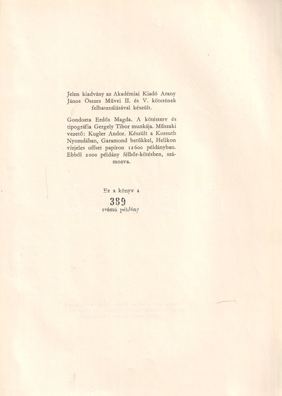 Kolofon: "Jelen kiadvány az Akadémiai Kiadó Arany János Összes Művei II. és V. kötetének felhasználásával készült. Gondozta Erdős Magda. A kötésterv és tipográfia Gergely Tibor munkája. Készült a Kossuth Nyomdában, Garamond betűkkel, Helikon vízjeles offset papíron 12,600 példányban. Ebből 2000 példány félbőr-kötésben, számozva. Ez a könyv a 389. számú példány".