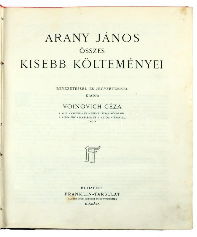 Arany János összes kisebb költeményei. Bevezetéssel és jegyzetekkel kiadja: Voinovich Géza. Bp., [1925], Franklin-Társulat, 2 t.+ 308 p. Átkötött félvászon-kötésben, sérült gerinccel, helyenként kissé foltos lapokkal.